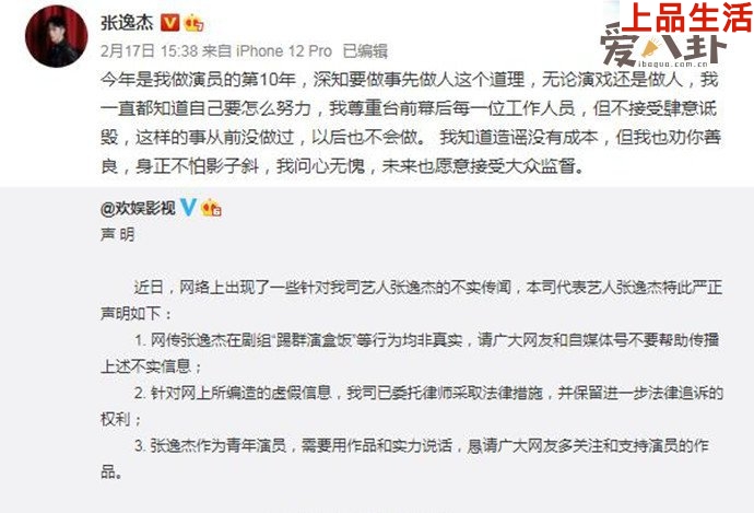 對(duì)于群演的爆料,張逸杰發(fā)文否認(rèn)踢飛群演飯盒,稱(chēng)自己出道10年,也知道演戲先做人,尊重臺(tái)前幕后的每位工作人員,并接受肆意詆毀。同時(shí)表示那是造謠,身正不怕影子斜,問(wèn)心無(wú)愧,未來(lái)原因接受大眾的監(jiān)督。其所屬公司歡娛影視也發(fā)聲明稱(chēng)是不實(shí)傳聞,請(qǐng)網(wǎng)友及自媒體號(hào)不傳播不實(shí)消息,若是編造的要追責(zé),多多關(guān)注和支持演員張逸杰的作品。xS7驛資訊