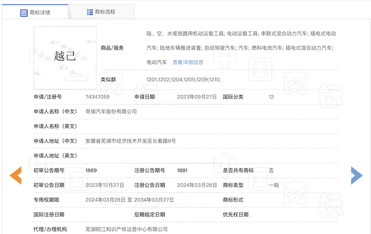 時代周報記者在國家知識產(chǎn)權(quán)局商標(biāo)局中國商標(biāo)網(wǎng)看到,奇瑞汽車股份有限公司去年9月27日就曾申請注冊“越己”商標(biāo),目前該商標(biāo)已注冊,注冊公告日期為今年3月28日,專用權(quán)期限為2024年3月28日至2034年3月27日。其國際分類為12,商品/服務(wù)涉及電動運(yùn)載工具、串聯(lián)式混合動力汽車、自動駕駛汽車、燃料電池汽車、插電式混合動力汽車等。此后,奇瑞汽車股份有限公司又于今年1月、2月多次申請“越己”商標(biāo)。BCJ驛資訊