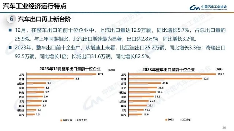 據(jù)中國汽車工業(yè)協(xié)會此前數(shù)據(jù)顯示,2023年中國汽車出口491萬輛,首次超越日本,成為全球第一大汽車出口國。在整車出口量前十位企業(yè)中,上汽、奇瑞、吉利排名前三,分別為109.9萬輛、92.5萬輛、40.8萬輛。jfr驛資訊