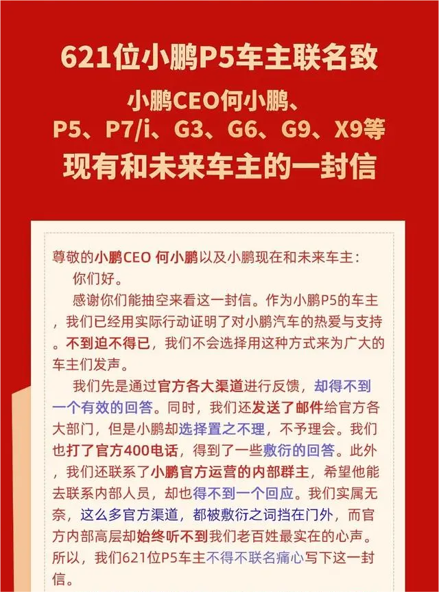 2023年11月,數(shù)百位小鵬P5車主公開發(fā)布致何小鵬及小鵬汽車車主、準(zhǔn)車主的聯(lián)名信,稱在提車近兩年時間內(nèi)并未體驗到此前官方宣傳的 CNGP(城市導(dǎo)航輔助駕駛)服務(wù)。