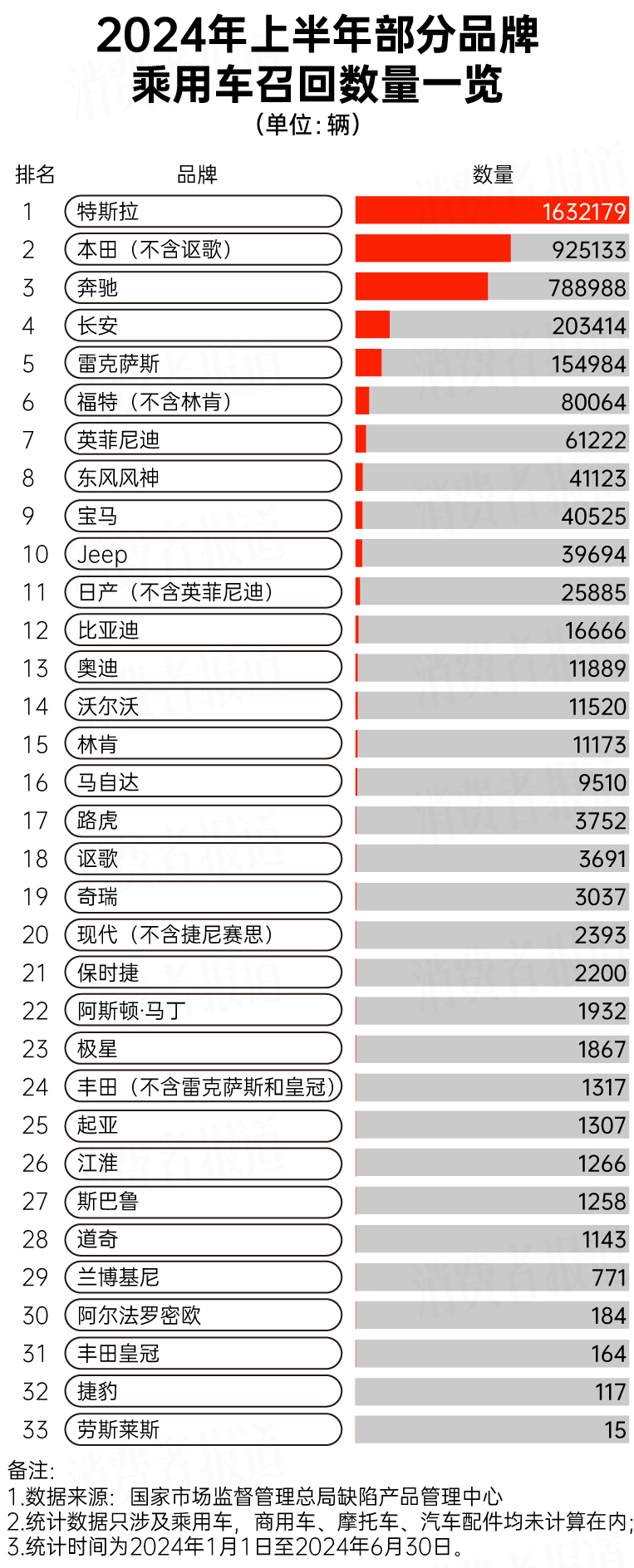 2024年上半年,特斯拉召回?cái)?shù)量最多,召回超過(guò)163.2萬(wàn)輛汽車。排在其后的本田(不含謳歌)召回超過(guò)92.5萬(wàn)輛汽車,而奔馳也召回近78.9萬(wàn)輛汽車。自主品牌中,長(zhǎng)安召回?cái)?shù)量最多,召回超過(guò)20.3萬(wàn)輛。XeZ驛資訊