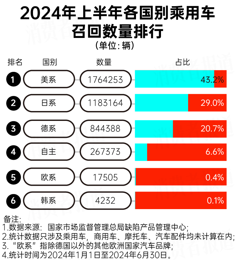 從品牌國(guó)別分析,美系車召回?cái)?shù)量最多,超過(guò)176.4萬(wàn)輛,占比43.2%。日系車緊隨其后,超過(guò)118.3萬(wàn)輛,占比29.0%。德系車位居第三,超過(guò)84.4萬(wàn)輛上榜,占比20.7%,而自主品牌也有超過(guò)26.7萬(wàn)輛汽車被召回。XeZ驛資訊