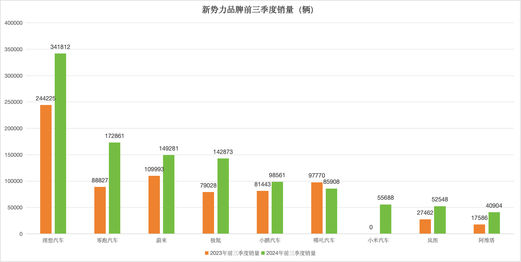 在前三季度,多家造車新勢力銷量表現也十分亮眼。如零跑汽車銷量達到17.3萬輛,同比激增94.6%,完成了全年目標的69.1%,兩項數字均居新勢力品牌首位;極氪作為吉利控股旗下單獨品牌,前三季度銷量也漲至14.3萬輛,目標完成度約62.1%。