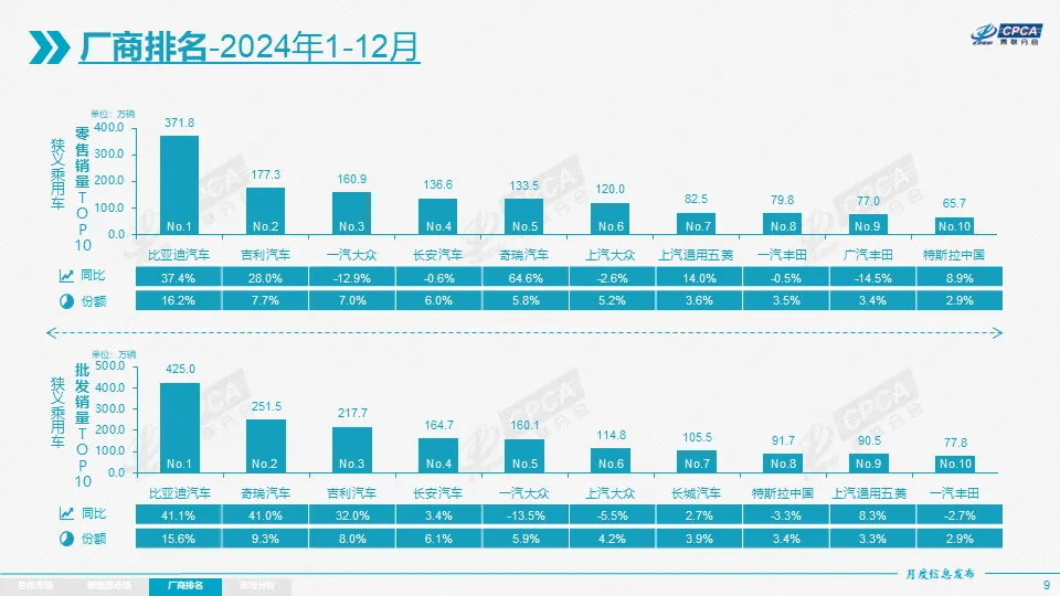 2024年全年,自主品牌累計(jì)份額達(dá)到61%,相較2023年同期增加8.6個(gè)百分點(diǎn)。比亞迪、吉利、奇瑞、長(zhǎng)安4家企業(yè)狹義乘用車(chē)(轎車(chē)、SUV、MPV)零售銷(xiāo)量均在前五之列,市場(chǎng)份額合計(jì)達(dá)到35.7%。而零售銷(xiāo)量排名前五的廠商中,僅有一汽大眾一家合資車(chē)企,其市場(chǎng)份額為7.0%,同比出現(xiàn)了12.9%的下滑。上汽大眾、一汽豐田、廣汽豐田零售銷(xiāo)量份額同樣出現(xiàn)了不同程度的下滑。3YH驛資訊