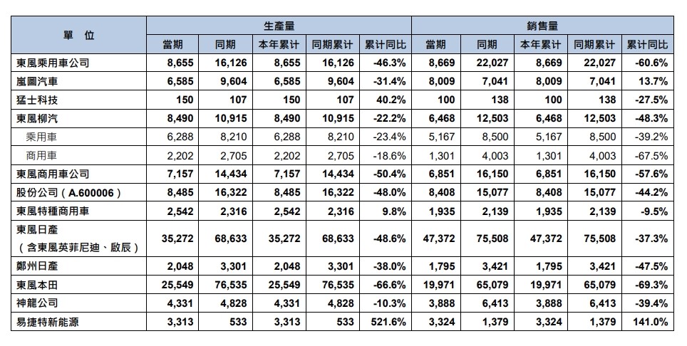 ▲來源:東風汽車產銷快報 8EC驛資訊