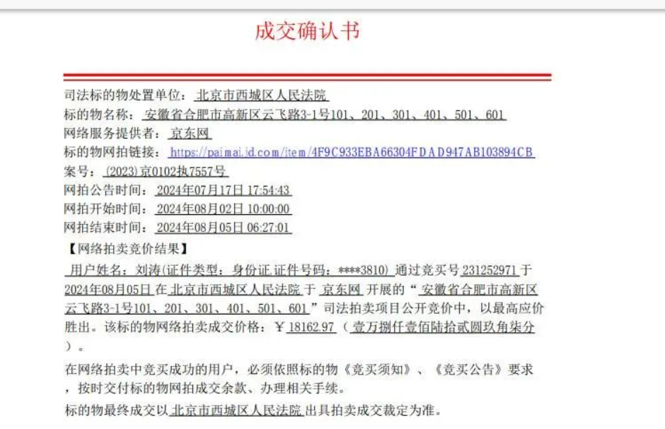 根據(jù)京東資產(chǎn)交易平臺,上述拍賣標的名稱為安徽省合肥市高新區(qū)云飛路3-1號高新區(qū)廠房101、201、301、401、501、601。bWk驛資訊